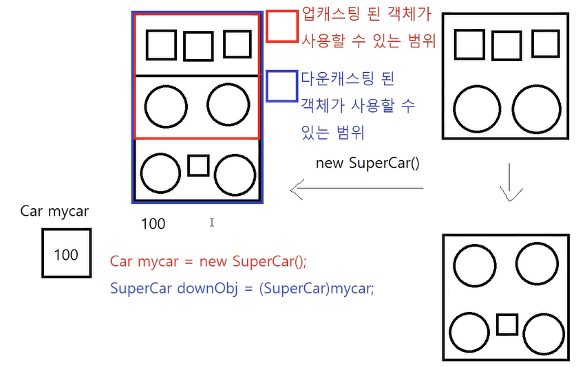 SuperCar downObj = ((SuperCar)garage[2]); //보통 다운캐스팅은 자식타입의 객체에 담아놓고 사용한다.